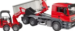 Das 2-farbige Führerhaus besitzt Türen zum Öffnen und bietet jeder bworld Figur einen modernen Arbeitsplatz. Der Abrollcontainer besitzt zwei schwenkbare Flügeltüren am Ende und kann von dem Greifarm nach hinten abgesetzt und wieder aufgenommen werden. Wenn der Container auf dem Boden steht und die Türen geöffnet sind, können die kleineren der BRUDER Fahrzeuge sogar in den Container fahren und dann von dem Container-LKW transportiert werden.