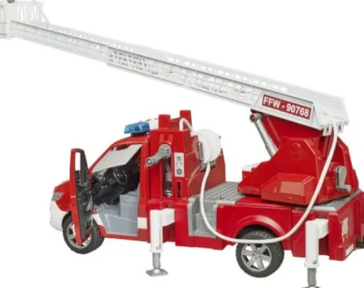 Zukunftsweisend, effizient, zuverlässig – so beschreibt Mercedes Benz den neuen Sprinter. Auch in der neuesten Generation bleibt er der vielseitige und allseits beliebte Transportprofi. Im umfangreichen Sortiment von BRUDER sind die neuesten Sprinter in unterschiedlichsten Varianten angekommen. Für schwierig zu bekämpfende Brandherde beispielsweise in engen Altstadtgasssen werden zunehmend kleinere Löschfahrzeuge eingesetzt. Hervorragend bewährt hat sich hierbei der Sprinter aufgrund seiner enormen Wendigkeit. BRUDER hat dieses Feuerwehrfahrzeug mit vielen realistischen Funktionsdetails ausgestattet. Im Mittelpunkt steht dabei die ausfahrbare Drehleiter mit Rettungskorb und die voll funktionsfähige Wasserspritze mit sichtbar arbeitender Kolbenpumpe, Wassertank und ausfahrbaren Stützfüssen, verschiedene Werkzeugaufnahmebehältnisse, sowie das neue Light & Sound Modul runden den sehr hohen Spielwert dieses Fahrzeugs ab.