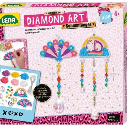 LENA® Diamond Art “Sonnenfänger“. Mit dem Inhalt dieses Sets können zwei funkelnde Suncatcher selbst gebastelt werden, die das Sonnenlicht brechen und so das ganze Kinderzimmer verzaubern. Enthält zwei bedruckte Acrylglasscheiben, Perlen, Anhänger und Faden. Mit ausführlicher, farbiger Anleitung. Für Kinder ab 6 Jahren. Verpackt in Faltschachtel mit Produktinformationen.