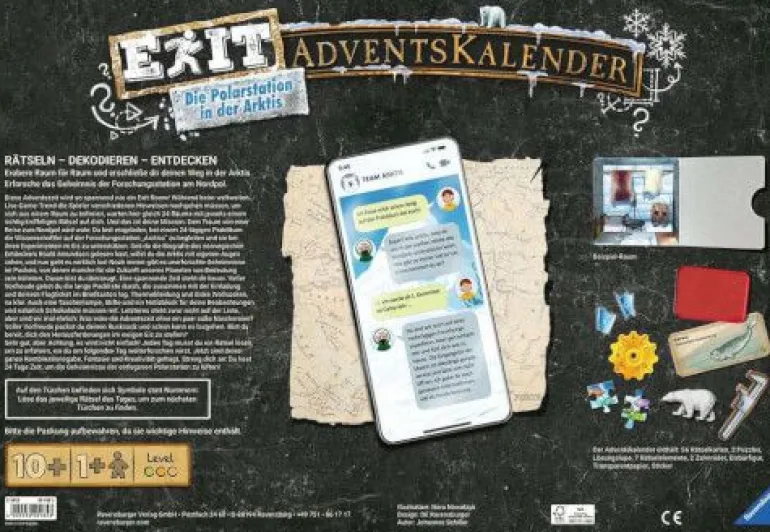 EXIT der Megatrend jetzt auch als Adventskalender! Tag für Tag, Raum für Raum, die Zeit läuft ab …Diese Adventszeit wird genauso spannend wie ein Escape Room! In jedem der 24 Fächer des Exit Adventskalenders ab 10 Jahren fordert ein kniffeliges Rätsel den Spieler heraus. Um die richtige Tür für den folgenden Tag zu finden, muss das Rätsel im Raum gelöst werden. Dazu finden sich Hinweise in den detailreich illustrierten Fächern, auf insgesamt 56 Rätselkarten und auf verschiedensten Knobelelementen.