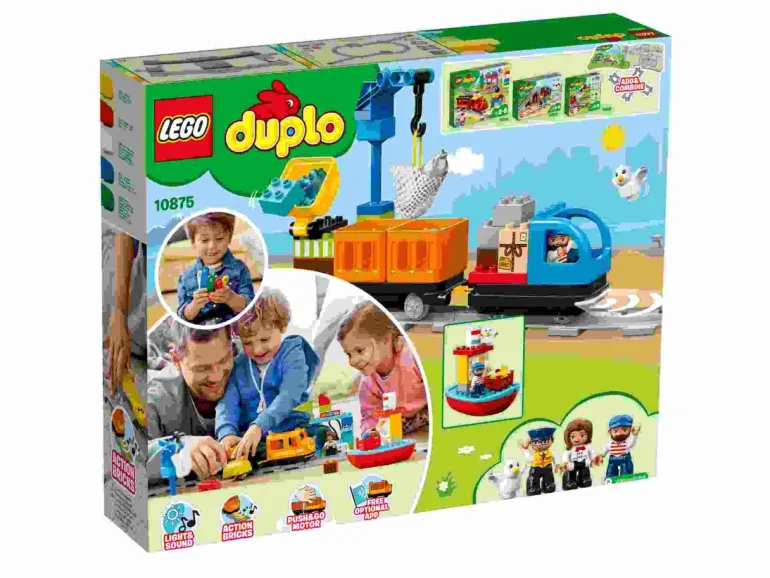 Der LEGO® DUPLO® Güterzug lässt sich jetzt noch leichter von Kleinkindern steuern und bietet ihnen verschiedene Interaktionsmöglichkeiten. Kleine Kinder verwandeln sich in Lokführer – mithilfe des „Push & Go“-Motors. Durch sanftes Anschieben fährt der Zug vorwärts oder rückwärts. Wird er dann festgehalten oder von den Schienen gehoben, stoppt der Motor. Die 5 farbigen Funktionssteine können entlang der Gleise platziert werden, um ein Signal ertönen zu lassen, die Lichter ein- und auszuschalten, die Fahrtrichtung zu ändern oder den Zug zu betanken und überall anzuhalten. Dieses LEGO DUPLO Set enthält einen Hafen, ein Boot, ein Café, einen Verladebahnhof, 2 Kräne, 3 DUPLO Figuren sowie eine Tierfigur und jede Menge coole Schienensegmente, damit Vorschulkinder Spielspaß mit einer klassischen Spielzeugeisenbahn erleben können. Die optionale App bietet zusätzliche Spielmöglichkeiten. Hierzu zählen eine Fernsteuerungsfunktion und lustige Aktivitäten für gemeinsamen Spielspaß mit Ihrem Kleinkind!