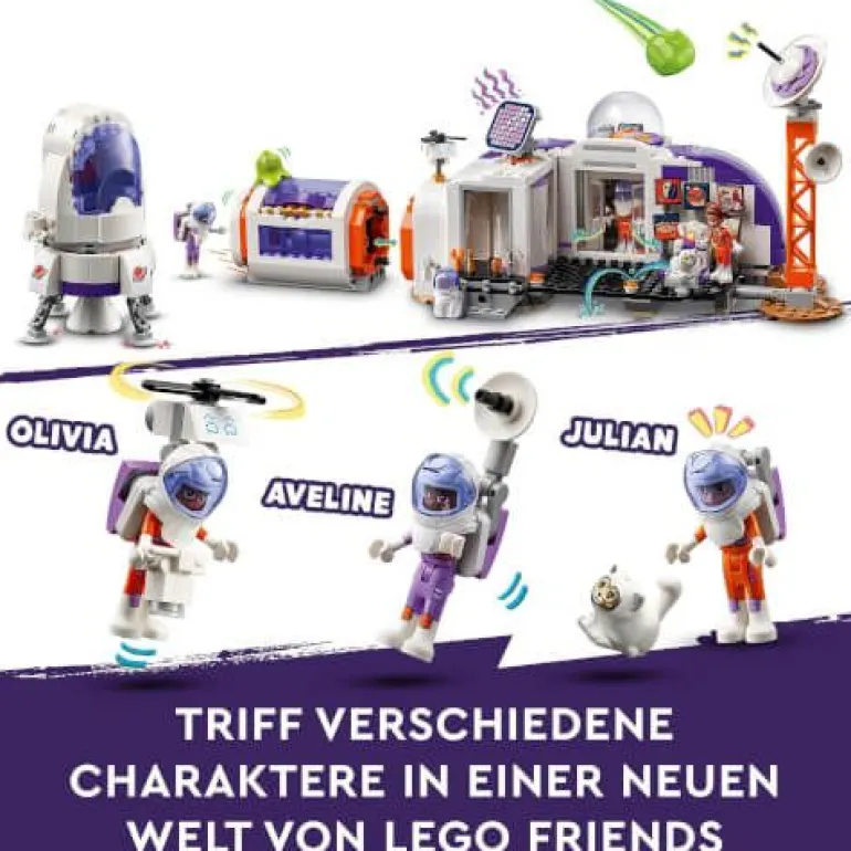 LEGO Friends Mars-Raumbasis mit Rakete (42605) inspiriert junge Forscher dazu, sich näher mit dem Weltraum zu befassen. Dieses Astronauten-Spielzeug hat alles, was Kinder brauchen, um auf unzählige Weltraummissionen zu gehen. Das LEGO Friends Weltraum-Spielzeug für Mädchen und Jungen ab 8 Jahren beinhaltet 3 Minipuppen und eine Spielzeug-Katze sowie eine LEGO Rakete, einen Erkundungsrover, eine Forschungsbasis aus Modulen und wissenschaftliches Zubehör. Kinder können sich ausmalen, wie es wäre, auf dem Mars zu leben, während sie die das LEGO Friends Space Shuttle bauen und die LEGO Freinds Figuren zur Forschungsbasis befördern. Dank des modularen Aufbaus kann man die verschiedenen Kapseln auch anders anordnen. In den Kapseln sind unter anderem Forschungs-, Kommunikations-, Gewächshaus- und Freizeitmodule untergebracht. Jede Menge Zubehör und Details wie ein LEGO Rover, eine Drohne und wissenschaftliche Instrumente laden zu vielen Rollenspielen ein. Zu dem LEGO Friends Weltraum-Set gehört auch eine spezielle Luftschleuse, damit dein Kind das Modell für weitere Abenteuer auch an andere kompatible (separat erhältliche) LEGO Raumfahrt-Sets andocken kann. Dieses Kinderspielzeug ist das ideale Geschenk für Weltraum-Fans und eignet sich vor allem als Geburtstagsgeschenk für Kinder, die Wissenschaft und Technik lieben. Die Rakete ist 20 cm hoch, 9 cm lang und 10 cm breit. Enthält 981 Teile.