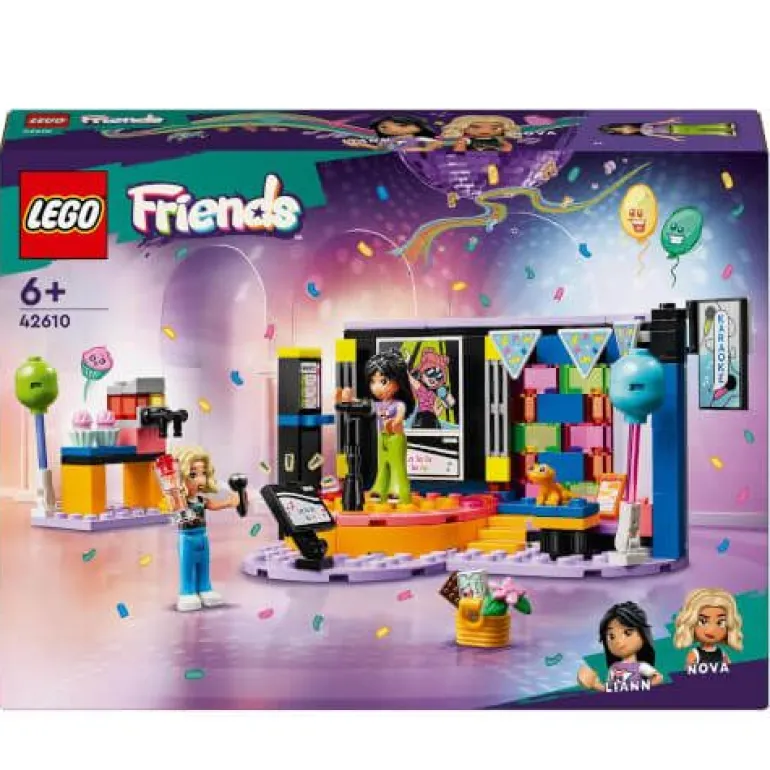 Die LEGO Friends Karaoke-Party (42610) ist ein Musikspielzeug für Mädchen und Jungen ab 6 Jahren, das Kinder eine Karaoke-Party darstellen lässt. Das Mini-Puppen-Set erwacht zum Leben, wenn dein Kind Lianns Geburtstagsparty als fantasievolles Rollenspiel darstellt. Für eine Karaoke-Geburtstagsparty beinhaltet der Baukasten für Kinder eine drehbare Bühne, Mikrofone, eine Sitzecke und eine Slush-Maschine. 2 LEGO Friends Figuren mit zusätzlichen Gesichtern, die die beiden Freundinnen singend darstellen, sowie ein Gecko und jede Menge Zubehör vervollständigen das kleine LEGO Set. Kinder können die Bühne mithilfe des Zahnrads drehen und so tun, als würden die Minipuppen (mit ihren singenden Gesichtern) in die Mikrofone trällern. Wenn die LEGO Friends Charaktere dann eine Pause brauchen, gönnen sie sich ein Slush-Eis und Cupcakes. Vielleicht kann Nova jetzt ihr Geburtstagsgeschenk an Liann überreichen? Entdecke noch mehr Kinderspielzeug im lustigen LEGO Friends Universum, wo Kinder viele Geschichten und wirklichkeitsgetreue Abenteuer darstellen können. Dieses LEGO Friends Set für Mädchen und Jungen ist eine tolle Geschenkidee für Kinder ab 6 Jahren, die Rollenspiele lieben und beim Spielen gern singen. Das Modell der Karaoke-Szene ist 8 cm hoch, 16 cm breit und 10 cm tief. Enthält 196 Teile.
