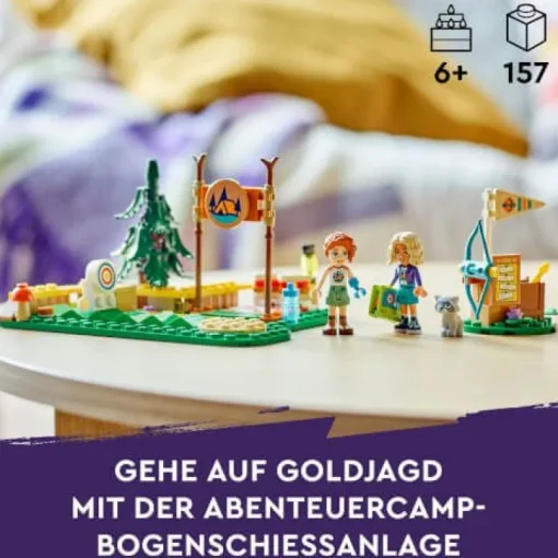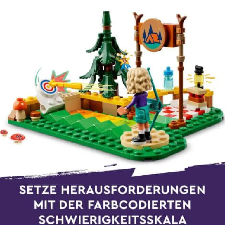 LEGO Friends Bogenschießen im Abenteuercamp (42622) ist ein Bauspielzeug für Kinder ab 6 Jahren. Das Spielzeug-Bogenschießset beinhaltet die Spielfiguren Autumn und Nova, einen Waschbären und jede Menge Sportzubehör. Mädchen und Jungen können so tun, als würden sie das Zielen üben. Der Bogen verschießt tatsächlich Pfeile. Wenn das Ziel vom Pfeil getroffen wird, klappt es nach unten. Es gibt eine farblich markierte Schwierigkeitsskala. Je weiter entfernt die Kinder das Ziel aufstellen, desto schwieriger wird die Aufgabe. Kleine Abenteurer können unzählige Geschichten mit dieser kreativem Spielzeug darstellen. Für Autumn sind 2 verschiedene Gesichter enthalten, um sie beim Zielen anders dreinblicken zu lassen. Nova bekommt das Bogenschießabzeichen für ihr Campaktivitätenbuch. Dann stärken sich Autumn und Nova mit einem Sandwich. Aber Vorsicht: Der freche Waschbär möchten den Freundinnen einen Happen wegschnappen! Dieses Kinder-Bogenschießset ist eine tolle Geschenkidee für Kinder. Zu dem Sport-Spielzeug ist auch die LEGO Builder App verfügbar, die ein leichtes und intuitives Bauabenteuer bietet. Die App lässt Kinder 3D-Ansichten der Modelle im Pfeil und Bogen Set vergrößern und drehen, Sets speichern und den Baufortschritt verfolgen. Die Bogenschießanlage ist 8 cm hoch, 14 cm breit und 12 cm tief. Enthält 157 Teile.