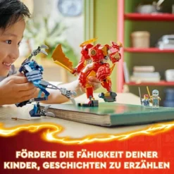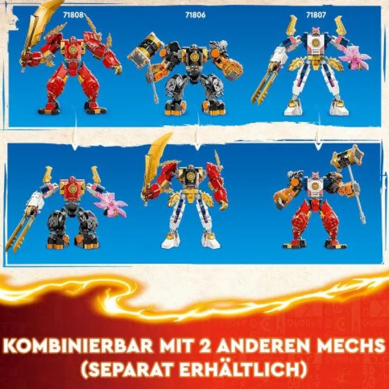 Mit Kais Feuermech (71808) können Kinder ab 7 Jahren die Abenteuer aus der 2. Staffel der TV-Serie NINJAGO Aufstieg der Drachen nachspielen. Mit diesem Action-Spielzeug für 7-jährige Jungs und Mädchen zum Umgestalten können Kinder ihren eigenen Mech erschaffen! Kinder können die beweglichen Arme und Beine verdrehen, um den LEGO NINJAGO Mech in dramatische Actionposen zu bringen. Außerdem hat die rote Mech-Figur ein Cockpit für die Minifigur Kai sowie ein großes goldenes Schwert für Duelle und Rollenspiele mit dem Mech des Wolfsclans. Seine Beine und Arme und auch seinen Oberkörper kann man abnehmen und mit den Teilen von 2 anderen Actionfiguren kombinieren: Coles Erdmech (71806) und Soras Technikmech (71807) sind separat erhältlich. Kinder können die Teile kombinieren und zu einem einzigartigen Actionfiguren-Spielzeug zusammenfügen. Das Set enthält außerdem 4 LEGO NINJAGO Figuren: Kai und Zane (jeweils mit einem Katana), Jordana mit einem Schwert und ein Wolfsjäger lassen Kinder packende Ninja-Duelle darstellen. Man kann die Figuren aus diesem Set auch mithilfe der LEGO Builder App zusammenstecken. Diese App nimmt dich und dein Kind auf ein einfaches und intuitives Bauabenteuer mit. Das Besondere an LEGO NINJAGO Sets liegt in der fesselnden Verschmelzung von faszinierenden Ninja-Abenteuern, innovativen Bauelementen und interaktiven Spielkonzepten. Dieses LEGO NINJAGO Ninja-Spielzeug ist ein tolles Geschenk für Kinder, die coole Roboterkämpfe lieben. Der NINJAGO Mech ist 16 cm groß. Enthält 322 Teile.