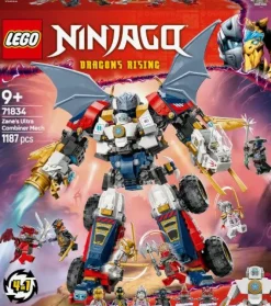 Zanes Ultra-Kombi-Mech (71834) ist ein 4-in-1-Bauset, das Jungen und Mädchen ab 9 Jahren unzählige Spielmöglichkeiten bietet und Fans packende Actionszenen aus der 3. Staffel der TV-Serie NINJAGO® Aufstieg der Drachen nachstellen lässt. Kinder können mit dem atemberaubenden Kombi-Mech spielen. Die Actionfigur kann Kopf, Drachenflügel, Beine, Füße, Arme, Handgelenke und Finger bewegen und hat ein Cockpit und 2 Shooter. Der Mech lässt sich auch in 4 kleinere Modelle zerlegen. Dann können Kinder einen Drachen, einen Jet, ein Auto und eine Zane-Actionfigur in spannende Duelle schicken. Der Drache hat bewegliche Funktionen und Flügel. Der Jet hat bewegliche Triebwerke und ein drehbares Cockpit. Und das Auto hat große Geländereifen und 2 aufklappbare Cockpits. In einem dieser Cockpits sind Blaster versteckt. Die 6 Minifiguren aus diesem Ninja-Spielset laden Kinder zu unzähligen Rollenspielen und Duellen ein. Die Ninja Sora und Cole sowie ihr Verbündeter Pixal schwingen coole Ninja-Schwerter, um es mit den drei Bösewichten aufzunehmen. Nokt, ein Drachenkämpfer und ein Drachenspäher sind ebenfalls bestens für spannende Duelle ausgerüstet.