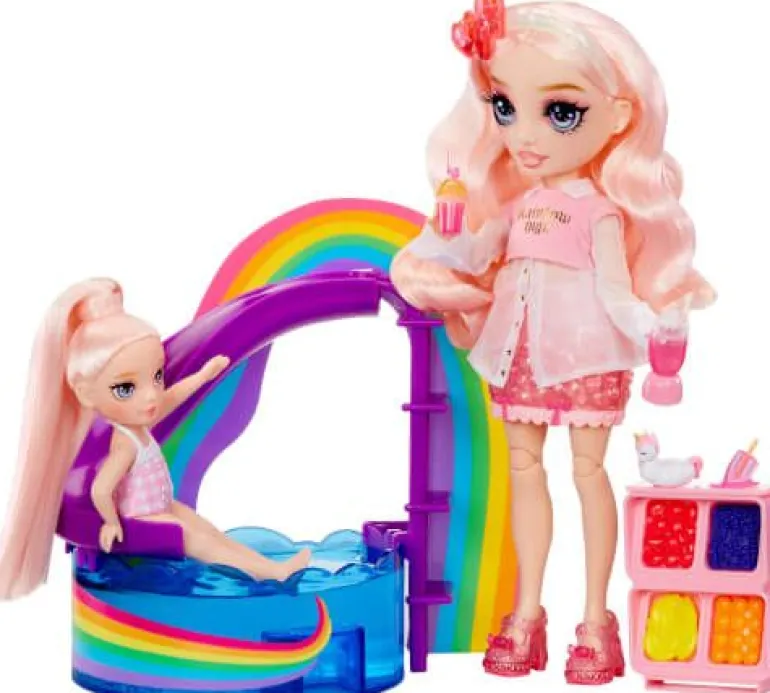 Das Spielset besteht aus einem Pool mit cooler Regenbogenrutsche und einer exklusiven Littles Puppe. Mit viel Pool-Zubehör wie Sonnenvisier, Eis, Handventiolator, Getränkehalter und Sonnencreme. Inklusive eines Smoothiestand mit Mixer, Früchten und zwei Bechern.