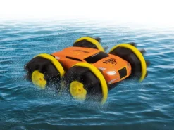 RC Stunt Car. Robustes Chassis mit kraftvollem Allrad-Antrieb. Mit 180° Flip und 360° Spin Funktion. Fährt auf dem Wasser. Mit 2.4 GHz Fernsteuerung. Modell-Länge: 160 mm. Ab 8 Jahren.