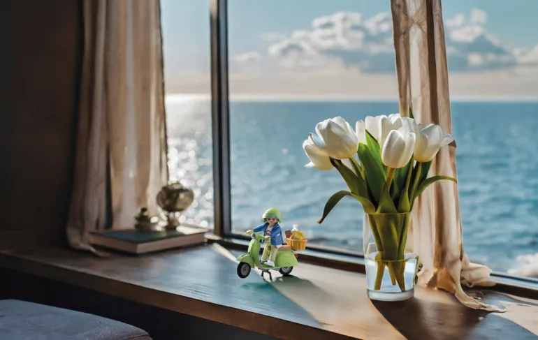 Figuren: 1 Frau; Zubehör: 1 Vespa, 2 Vespasattel braun, 1 Helm, 1 Korb, 1 Geldbörse, 1 Kekspackung, 1 Safttüte
