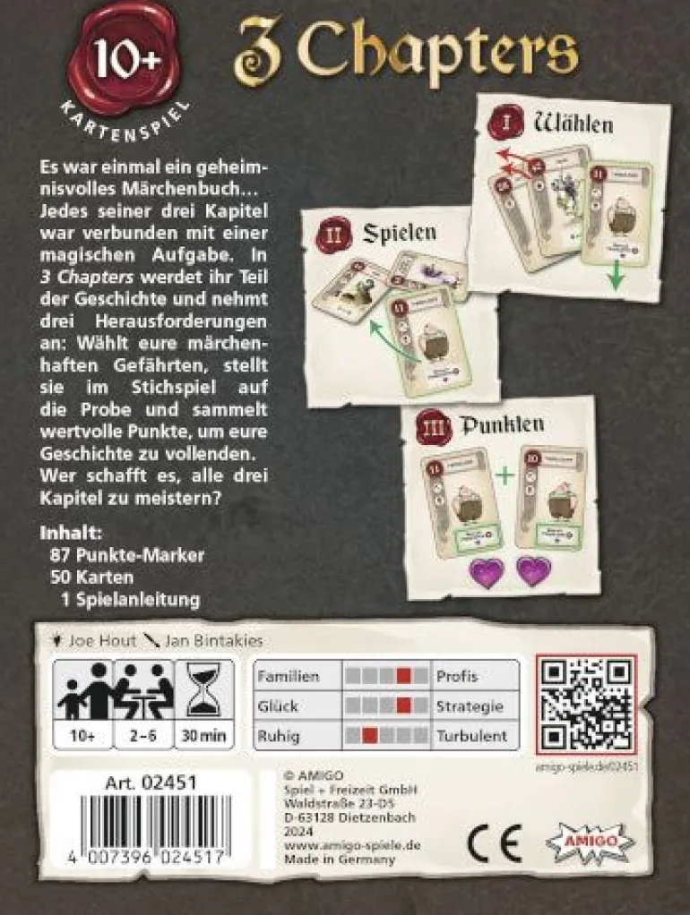 3 Chapters MBE3 So spielt man 3 Chapters MBE3: * 3 Chapters ist in drei Kapitel aufgeteilt, die euch auf eine märchenhafte Probe stellen. * Chapter 1: Ihr erhaltet je acht Karten, von denen ihr euch eine aussucht und die anderen im Uhrzeigersinn weitergebt. Von den neu erhaltenen Karten wählt ihr wieder eine aus und gebt die verbliebenen weiter. Das macht ihr so lange, bis ihr sieben (bzw. acht) Handkarten habt. * Chapter 2: Spielt jeweils eine Karte aus. Die höchste Karte gewinnt den Stich und erhält zwei Punkte. Vergleicht außerdem die Fähigkeiten auf euren Karten miteinander, denn so könnt ihr zusätzliche Punkte erhalten. * Chapter 3: Zum Schluss wertet ihr die Fähigkeiten innerhalb eurer ausgewählten Handkarten aus. Sie können in diesem Kapitel weitere Punkte einbringen. * Wer am Ende die meisten Punkte hat, gewinnt. Inhalt: * 87 Punkte-Marker * 50 Karten * 1 Spielanleitung Maße: 17,1 x 12,8 x 3,7 cm Autor: Joe Hout Grafik: Jan Bintakies Erfolgsfaktoren: * Spannende Abwechslung durch Draft-Mechanismus (rotierende Weitergabe Kartenauswahl) * Stichspiel mit leicht gehobenem Anspruch, ideal für Wizard-Fans * Märchenhafte Illustrationen