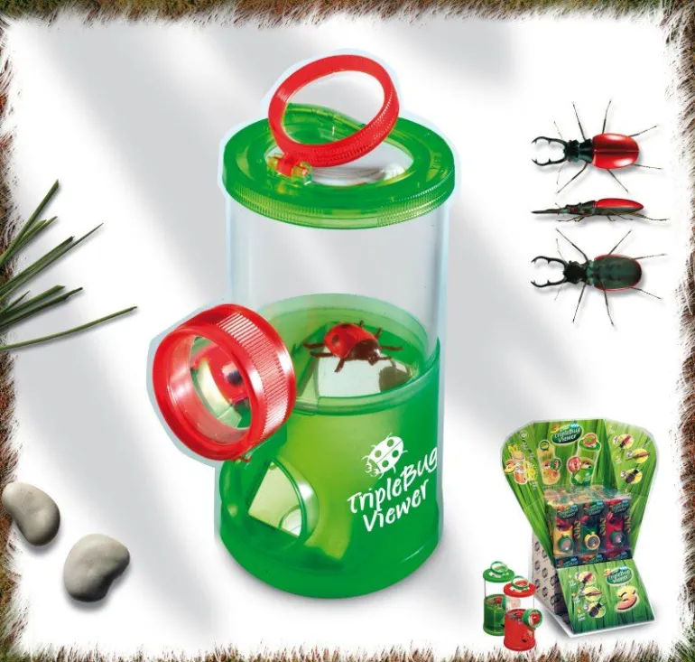 Insektenbeobachter mit 3-fach Funktion (oben, Mitte, unten) inklusive Spiegel und Pinzette. Technische Daten: 5 optische Elemente, Linsen 32/45 mm Durchmesser, 2-4-fache Vergrösserung. Rot, gelb, grün und blau möglich (alle transparent). Maße: 7 x 8.5 x 13.5 cm.