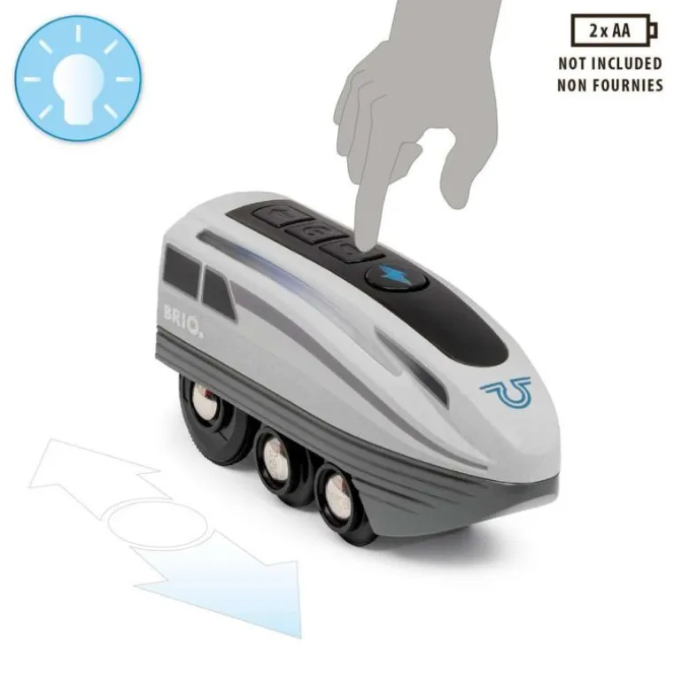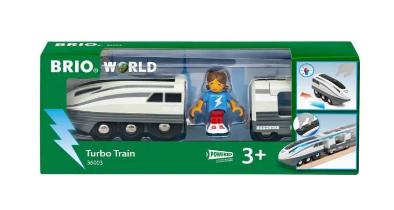 Bringt noch mehr Tempo auf die Schiene: Der 36003 Turbo-Zug. Einfach auf den großen Turbo-Knopf drücken und schon verdoppelt diese batteriebetriebene Spielzuglok ihre Geschwindigkeit. Damit ist sie die schnellste Lok in der BRIO World.