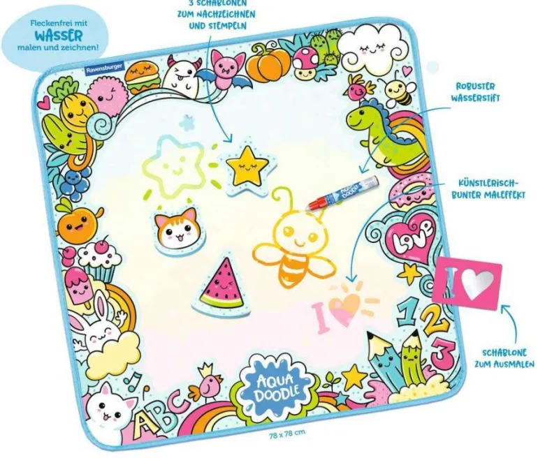 Aquadoodle Little Artist ist das perfekte Geschenk für kreativen ersten Malspaß! Mit reinem Leitungsasser zaubern die Kinder künstlerisch-bunte Striche auf die Matte. Viele kindgerechte Motive rings um die Matte sowie 4 verschiedene Schablonen regen zu immer neuen Malversuchen an. Trocknet das Wasser, verschwindet alles und der Spaß beginnt von Neuem.