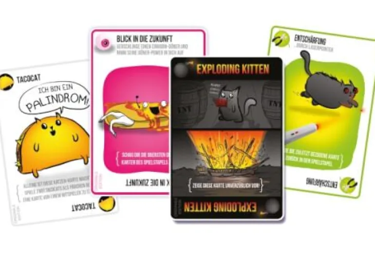 Exploding Kittens ist eine taktische Version von Russisch Roulette nur eben mit Kätzchen statt Patronen. Die Spieler ziehen reihum Karten, bis einer ein Exploding Kitten zieht. Derjenige explodiert sofort, stirbt und scheidet aus es sei denn, er hat eine Karte zur Entschärfung. Mit ihr kann er das Kätzchen beruhigen und vom Explodieren abhalten, zum Beispiel mithilfe eines Laserpointers, Katzenminze oder durch Bauchkraulen. Alle anderen Karten dienen nur einem Zweck: zu verhindern, dass man ein Exploding Kitten zieht.