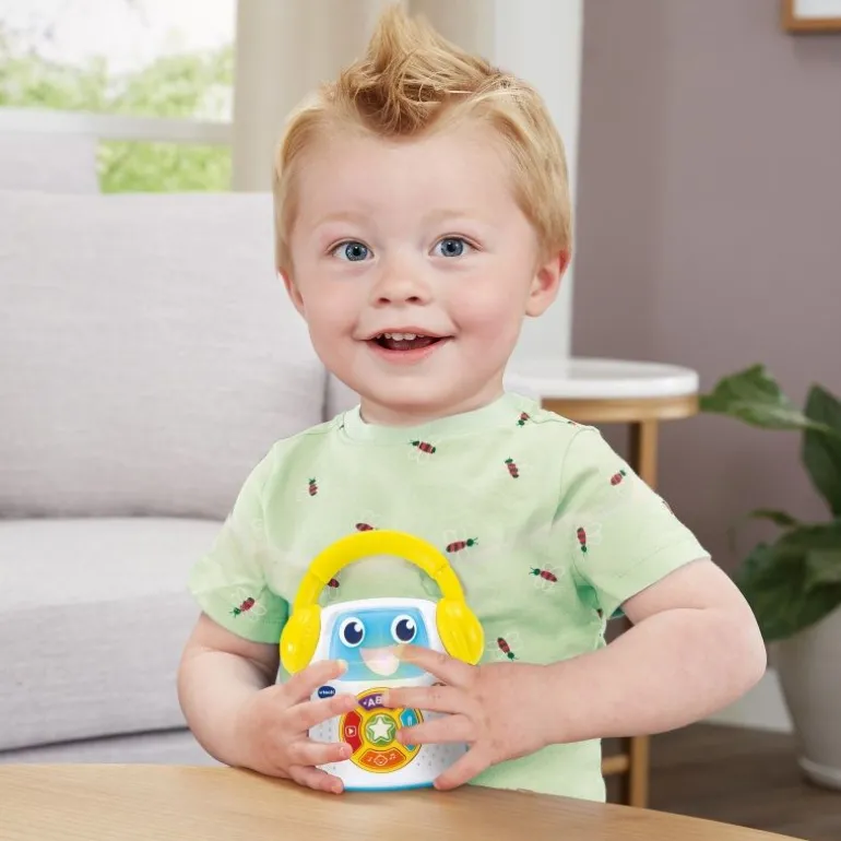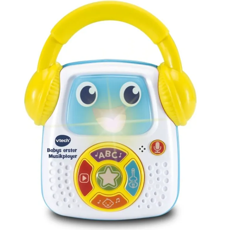 Der erste Musikplayer für unterwegs! Süßer Musikplayer mit praktischem Tragegriff, der zu musikalischen Entdeckungen einlädt. 5 Spielmodi mit eigenen Tasten: Modus für Abzählreime, Modus für klassische Musik zum Entspannen, Liedermodus, Sternmodus zur Interaktion mit dem Musikplayer, Aufnahmemodus. Im Aufnahmemodus können Eltern ein eigenes Lied, eine kurze Geschichte, liebevolle Wörter etc. fürs Kind aufnehmen, die hinterher wieder abgespielt werden können. Leuchtender Mund. Lautstärkeregler, kindersicheres Batteriefach und Abschaltautomatik. Demobatterien sind enthalten.