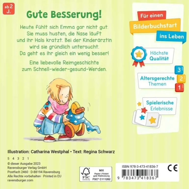 Gute Besserung, Emma! Die kurze Reimgeschichte ist leicht verständlich und nimmt Kindern ab 2 Jahren einfühlsam und kindgerecht die Angst vor dem Arztbesuch.Dank der kurzen Reime können auch schon die Kleinsten der Geschichte gut folgen und sich mit Emma und ihren Erlebnissen leicht identifizieren. Viele Kinder gehen nicht gerne zum Arzt, weil sie nicht wissen, was sie dort erwartet oder sie sich vor den Untersuchungen fürchten. Die Reimgeschichte bietet tolle Gesprächsanlässe und zeigt den Kleinsten einfühlsam und kindgerecht, was beim Kinderarzt passiert und wie man schnell wieder gesund wird.