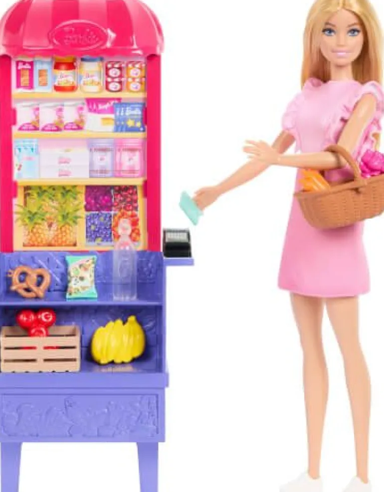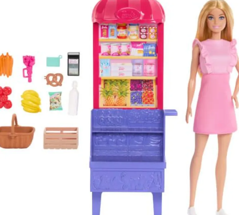• Kinder bestimmen die Einkaufsliste, wenn sie die Barbie-Puppe Malibu“ mit diesem Spielset auf den Markt begleiten. Im Set enthalten sind eine Modepuppe, ein Marktstand und 11 themenbezogene Zubehörteile.