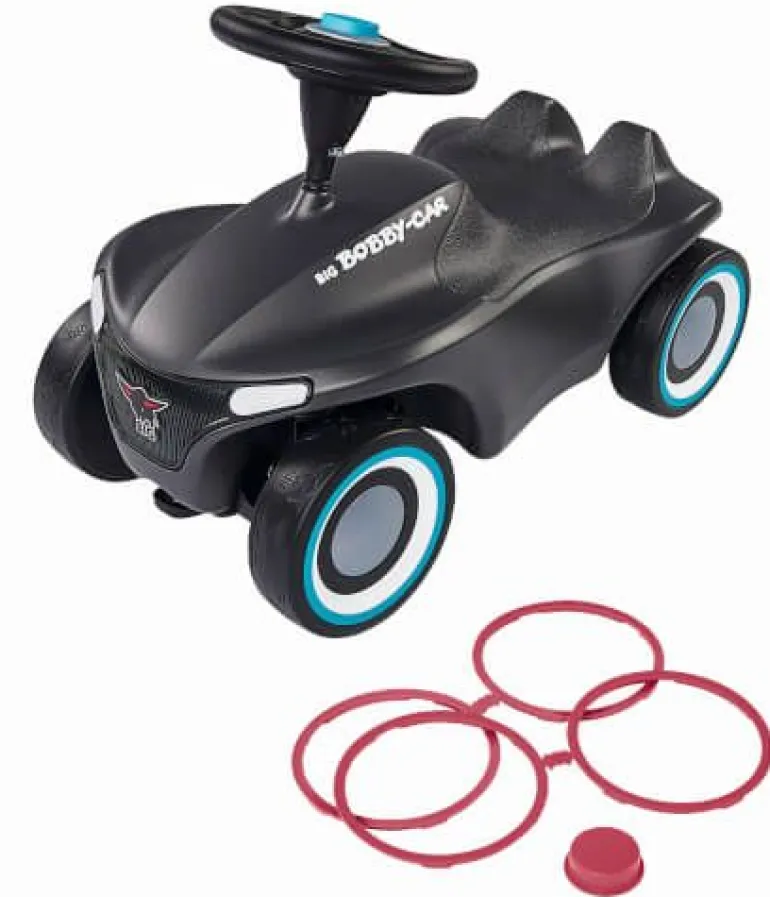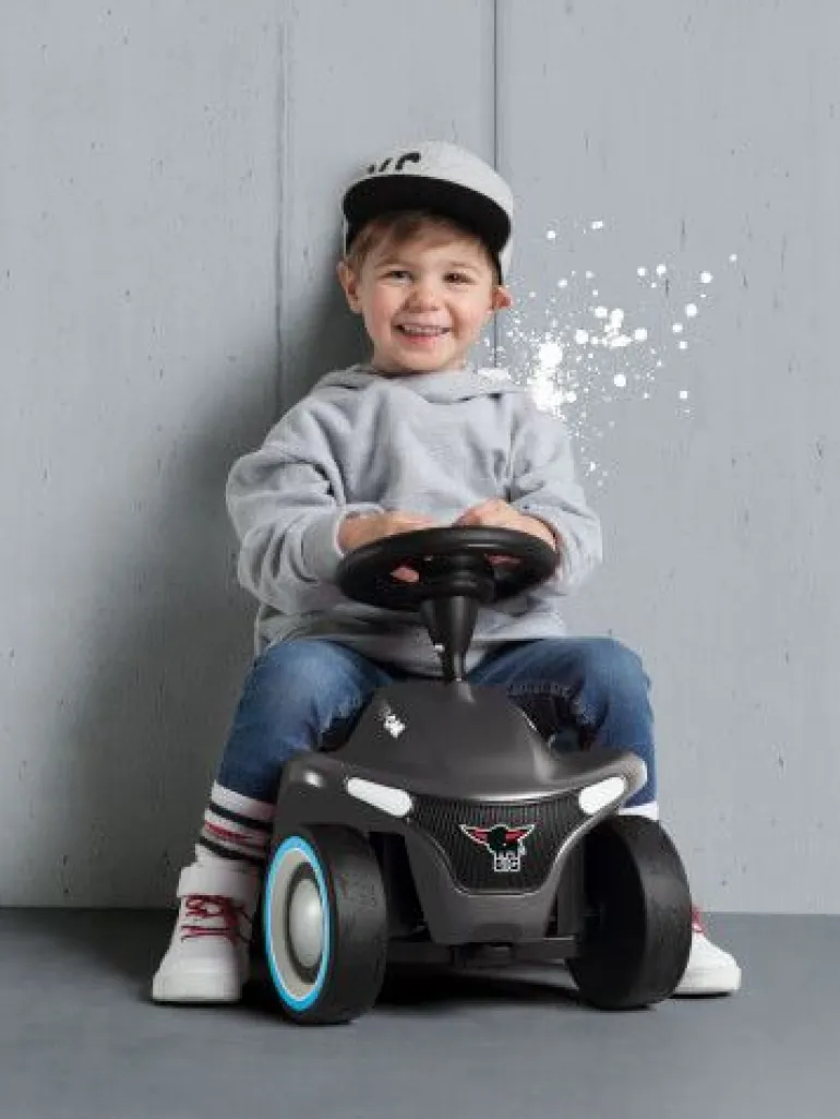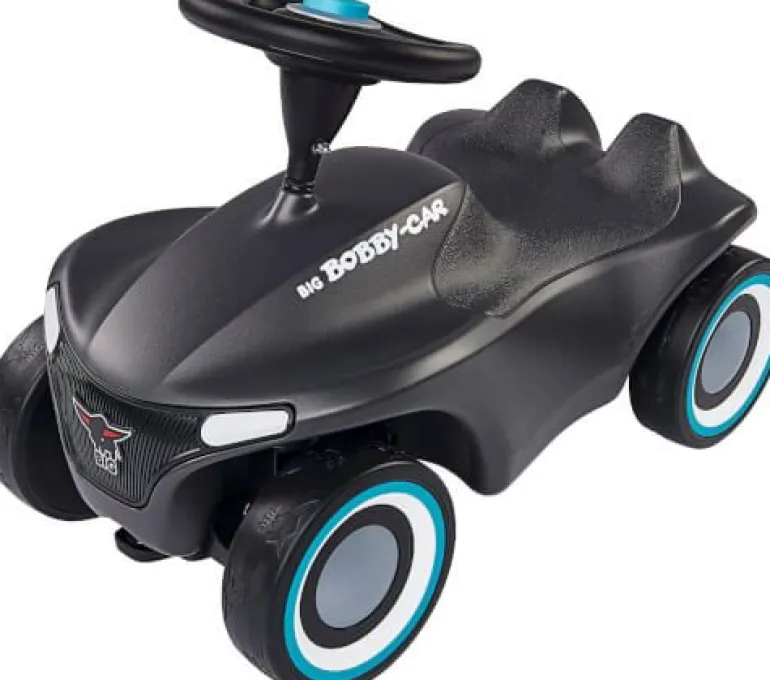 Facelift einer Legende- mit dem BIG-Bobby-Car Neo präsentiert BIG eine neue Generation seines Rutschfahrzeug-Klassikers, der schon viele Jahrgänge von Kindern begleitet und begeistert hat. Das revolutionäre, moderne Design stellt das Wappentier, den BIG-Büffel, ganz besonders heraus. So ist z.B. der hochwertig bedruckte Kühlergrill in Form des Büffels gehalten und die breiten Flüsterreifen verfügen über ein einzigartiges Büffel-Profil. Die Variante in schickem Anthrazit verfügt über ein ganz besonderes Gimmick: Dem Rutschauto sind Felgenringe und Hupendeckel in 2 verschiedenen Farben beigelegt: Türkis und Pink. So kann das BIG-Bobby-Car ganz nach Geschmack immer wieder umgestaltet werden. Das Chassis ist in neuer stylischer Form überarbeitet, die ergonomisch geformte Sitzfläche verfügt über eine Anti-Rutsch-Oberfläche. Das Kult-Auto verfügt nach wie vor über eine Sicherheits-Kniemulde und die Beinauflage. Die Rücklichter sind vormontierte Kunststoffteile in Form stilisierter Büffelhörner. Das leichtgängige Vollschalen-Sicherheitslenkrad sorgt für einen optimalen Griff und eine angenehme Haptik. Das BIG-Bobby-Car Neo wird serienmäßig mit extra breiten, hochwertigen und abriebfesten Weichkunststoff-Reifen geliefert, die für guten Grip sorgen und flüsterleise rollen. Des Weiteren verfügt die neue Version des kultigen Rutschautos über 3-teilige geschlossene Felgen, die besonders leicht zu reinigen sind. Eine abnehmbare Abschleppvorrichtung vorne unter dem Kühlergrill und eine Anhängerkupplung am Heck ermöglichen das Ankoppeln von BIG-Bobby-Car Zubehör, sowie die Nutzung aller gängigen BIG-Bobby-Car-Anhänger. Das BIG-Bobby-Car Neo ist revolutionär in seiner Form und unschlagbar in Sachen Qualität. Hergestellt wird es aus umweltfreundlichem und strapazierfähigem Kunststoff im modernen BIG-Werk in Deutschland. Für Qualität und Sicherheit bü Facelift einer Legende- mit dem BIG-Bobby-Car Neo präsentiert BIG eine neue Generation seines Rutschfahrzeug-Klassikers, der schon viele Jahrgänge von Kindern begleitet und begeistert hat. Das revolutionäre, moderne Design stellt das Wappentier, den BIG-Büffel, ganz besonders heraus. So ist z.B. der hochwertig bedruckte Kühlergrill in Form des Büffels gehalten und die breiten Flüsterreifen verfügen über ein einzigartiges Büffel-Profil. Die Variante in schickem Anthrazit verfügt über ein ganz besonderes Gimmick: Dem Rutschauto sind Felgenringe und Hupendeckel in 2 verschiedenen Farben beigelegt: Türkis und Pink. So kann das BIG-Bobby-Car ganz nach Geschmack immer wieder umgestaltet werden. Das Chassis ist in neuer stylischer Form überarbeitet, die ergonomisch geformte Sitzfläche verfügt über eine Anti-Rutsch-Oberfläche. Das Kult-Auto verfügt nach wie vor über eine Sicherheits-Kniemulde und die Beinauflage. Die Rücklichter sind vormontierte Kunststoffteile in Form stilisierter Büffelhörner. Das leichtgängige Vollschalen-Sicherheitslenkrad sorgt für einen optimalen Griff und eine angenehme Haptik. Das BIG-Bobby-Car Neo wird serienmäßig mit extra breiten, hochwertigen und abriebfesten Weichkunststoff-Reifen geliefert, die für guten Grip sorgen und flüsterleise rollen. Des Weiteren verfügt die neue Version des kultigen Rutschautos über 3-teilige geschlossene Felgen, die besonders leicht zu reinigen sind. Eine abnehmbare Abschleppvorrichtung vorne unter dem Kühlergrill und eine Anhängerkupplung am Heck ermöglichen das Ankoppeln von BIG-Bobby-Car Zubehör, sowie die Nutzung aller gängigen BIG-Bobby-Car-Anhänger. Das BIG-Bobby-Car Neo ist revolutionär in seiner Form und unschlagbar in Sachen Qualität. Hergestellt wird es aus umweltfreundlichem und strapazierfähigem Kunststoff im modernen BIG-Werk in Deutschland.