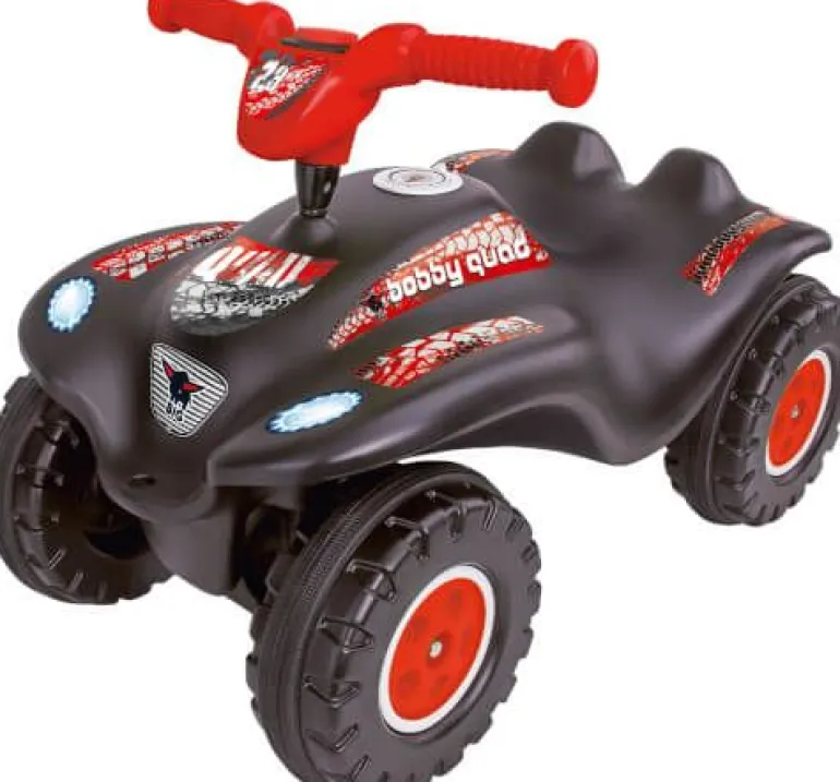 Das neue BIG Bobby Quad Racing vereint büffelstarke Power und ein modernes Design in Racing-Optik zu einem einzigartigen Rutschfahrzeug für Kinder ab 3 Jahren. Damit ist es für die Kids der ideale Nachfolger fürs BIG Bobby Car. Mit einer Sitzhöhe von 27 cm im Vergleich zu ca. 18 cm beim BIG Bobby Car können größere Kinder bequem mit dem rasanten Fahrzeug den Kleinen hinterherfahren. Damit sind spannende Rennen garantiert! Und auch in Sachen Ausstattung ist das große BIG Bobby Quad Racing ein Highlight: Vier extra breite und große Räder mit Offroad-Profil und Laufringen aus weichem Kunststoff sorgen für einen guten Grip und leise Fahrgeräusche. Der robuste Blasformkörper garantiert ausgezeichnete Stabilität und wird aus strapazierfähigem, umweltfreundlichem Kunststoffmaterial gefertigt. Durch einen Sicherheitslenker mit Hupe und Handschutz, den tief liegenden Schwerpunkt und ergonomisch geformte Beinauflagen sind die kleinen und großen Fahrer bequem und sicher unterwegs. Die hochwertige Ausstattung ergänzt ein Geheimfach für kleine Schätze der Fahrer und dient gleichzeitig als kleine Tachoanzeige. Hergestellt wird das BIG Bobby Quad Racing im modernen BIG-Werk in Deutschland. Vom Hersteller des BIG Bobby Car – BIG-büffelstark! Für Kinder ab 3 Jahren.