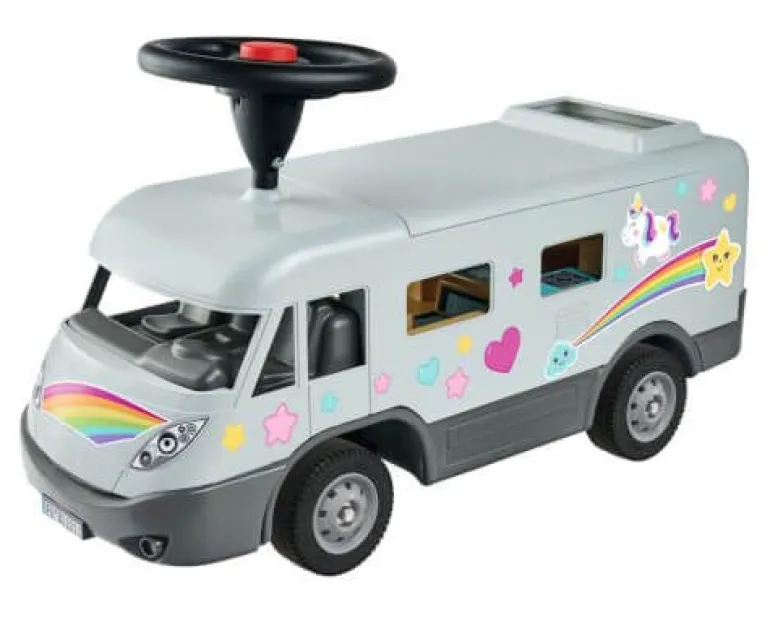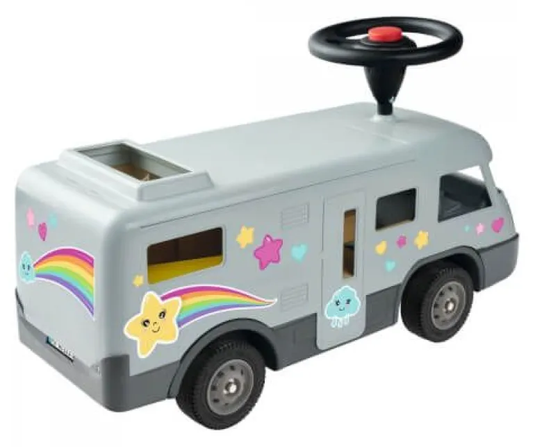 Das detailliert gestaltete Wohnmobil ist das ideale Rutschauto für spielerisches Reisen mit jeder Menge Spaßfaktor. Unter dem abnehmbaren Dach des Campers verbirgt sich ein geräumiger Innenbereich, der ausreichend Platz für Spielfiguren und Puppen bis 12 cm bietet. Diese können die kleinen Abenteurerinnen und Abenteurer bei ihren Ausflügen begleiten und sind allzeit bereit, ihnen in kurzen Verschnaufpausen Gesellschaft zu leisten. Die lustigen Sticker ermöglichen ein individuelles Design und sorgen, genau wie die liebevoll gestaltete Fahrerkabine, für das gewisse Etwas.