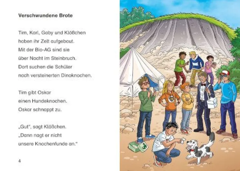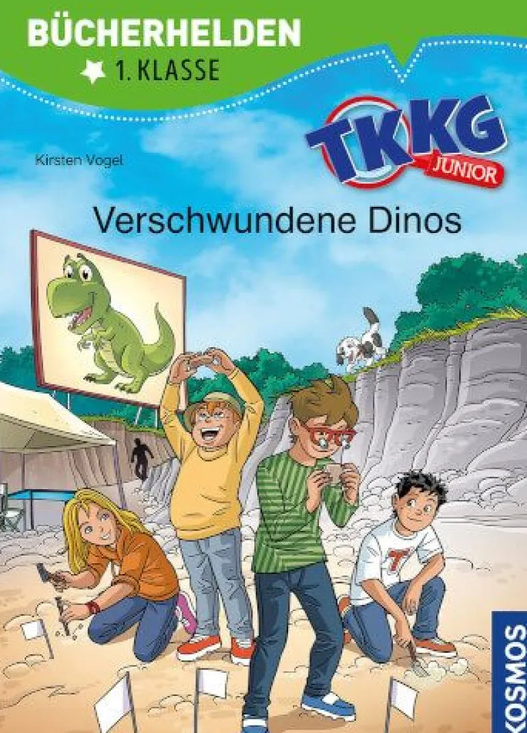 Diebstahl im Steinbruch! Mit Hammer und Pinsel ausgestattet suchen Tim, Karl, Klößchen und Gaby mit ihrer Bio-AG nach Fossilien. Sie erfahren viel über Archäologie und über das Leben der Dinosaurier. Tim findet bei den Ausgrabungen sogar einen perfekt erhaltenen versteinerten Dinosaurier-Knochen. Als dieser verschwindet und weitere seltsame Dinge im Steinbruch und auf dem Zeltplatz geschehen, nehmen TKKG Junior die Ermittlungen auf. Hund Oskar wittert bald eine erste Fährte. Wer ist der dreiste Dieb? In sechs Kapitel erleben Kinder ab der ersten Klasse einen aufregenden Krimi. Mit vielen Illustrationen und einem Rätsel nach jedem Kapitel – eine Bücherhelden-Geschichte für Leseanfänger.