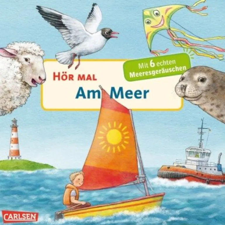 Hör mal: Das Meer. So klingt das Meer: Möwen kreischen in der Luft, das Rauschen der Wellen ist von Weitem schon zu hören, Schafe blöken auf dem Deich und auf einer Sandbank schnaufen die Kegelrobben. Der Wind treibt die Segelboote an und die Drachen in die Höhe. Und hörst du auch das Tuten des Schiffes? Ab 2 Jahren.