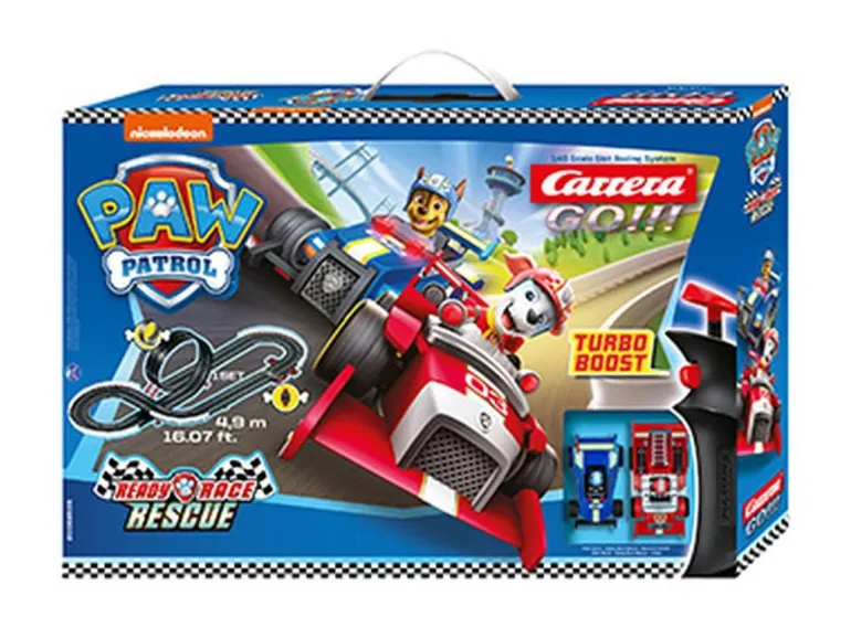Tierischer Spaß auf der Rennstrecke! Die beliebten Helfer auf vier Pfoten von PAW Patrol tauchen im Carrera GO!!! „PAW Patrol – Ready Race Rescue“ Set wieder in aufregende Abenteuer ein. Auf der 4,9 Meter langen Carrera GO!!! Autorennbahn flitzen der Hundeheld Chase in seinem coolen, blauen Polizeiwagen und der schusselige Dalmatiner Marshall im roten Feuerwehrauto um die Wette. Zusammen sorgen sie für Sicherheit und Ordnung in den heimischen Kinderzimmern. Mit viel Geschick am Handregler können alle kleinen und großen Rennfahrer in den Highspeed-Geraden, Kurven und dem Looping ihr Können unter Beweis stellen. Wer ist der Erste am nächsten Einsatzort?