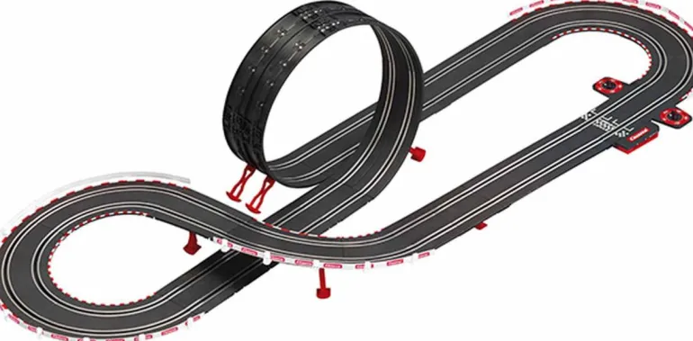Action-Rennbahn im Maßstab 1:43 ~ Originalgetreue Fahrzeuge im Maßstab 1:43 ~ Schienenelemente für actiongeladenen Fahrspaß ~ Handregler mit Turbo-Button für mehr Geschwindigkeit