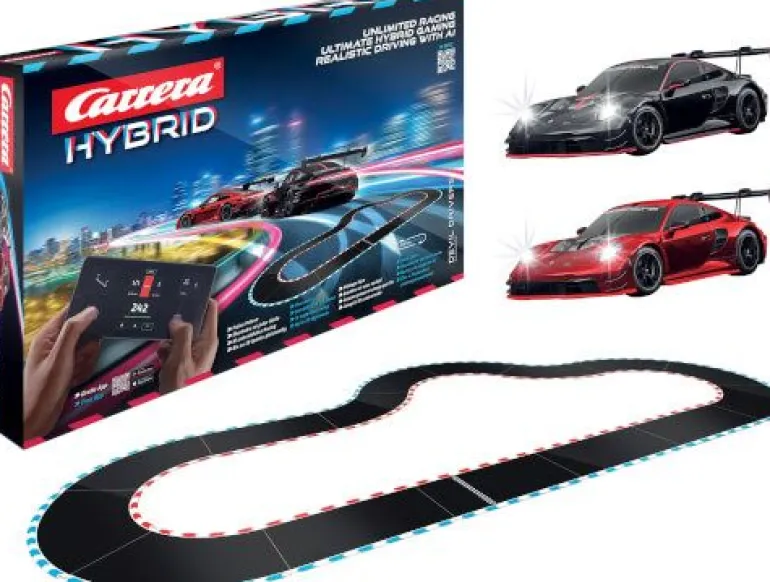 Carrera Hybrid garantiert Rennspaß für bis zu 30 Fahrer gleichzeitig ~ Extra breite Schienen im Maßstab 1:50 ~ Originalgetreue Fahrzeuge im Maßstab 1:50 mit Front- und Rücklicht ~ Steuerung mittels kostenloser App für Smartphone oder Tablet. ~ Fulllspeed Spurwechseln und Überholen an jeder Stelle der Strecke ~ Individuelle Einstellungen von Geschwindigkeit, Reifengrip und Bremswirkung und vielen weiteren Parametern für jedes einzelne Fahrzeug ~ Original getreues Motorengeräusch in der App ~ Fahrzeuge können selbst zurück auf die Fahrbahn fahren, wenn sie von der Strecke abkommen ~ Freischaltung von weiteren Schwierigkeitsleveln ensprechend dem Gaming Gedanken ~ Online/Offline Multiplayer ~ Verschiedene Level möglich ~ Porsche 911 GT3 R “Black Devil“ ~ Porsche 911 GT3 R “Red Devil“ ~ Streckenlänge: 6,09 m ~ Altersempfehlung: 12+