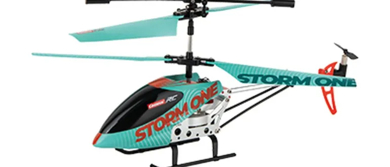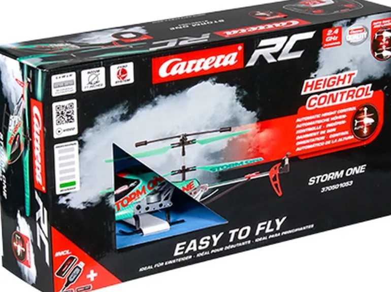 Abheben und Spaß haben! Der Carrera RC Storm One Helikopter ist bereit für die Erkundung des Luftraums. Der coole Helikopter in türkis mit orangen Highlights mit einem Rotordurchmesse von 19.5 cm macht bei seinen Flügen mit den Piloten ab 8 Jahren eine gute Figur. Im Wohn- und Kinderzimmer erforscht er durch die präzise Digital Proportional alle Ecken zielgenau. Durch die Auto-Start- und Landefunktion und die automatische Höhenkontrolle ist er auch für Einsteiger einfach zu fliegen – so macht abheben Spaß! Mit dem Storm One dauert die Flugreise bis zu 6 Minuten, bevor der fest verbaute 3,7 V – 150 mAh Li-Po Akku für ca. 30 Minuten aufgeladen werden muss. Der Storm One is „Ready to Fly“ und startet seinen Flug direkt aus der Verpackung.