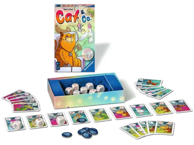 Die Party ist in vollem Gang, doch Kater Carlo, der Miesepeter, knipst schon wieder das Licht aus! Wer kann sich noch erinnern, welche Tiere mitgefeiert haben? Die Tiere auf den Würfeln sind von allen Spielern nur ganz kurz zu sehen, bevor die Schachtel wieder zu ist. Karte für Karte legen nun die Spieler die Tiere nach. Aber waren es zwei oder sogar drei Kakadus? Wer es sich am besten merken konnte, gewinnt!Der Startspieler schüttelt alle Tierwürfel in der Box und öffnet den Deckel. Alle Spieler versuchen sich gleichzeitig zu merken, welche Tierart wie oft zu sehen ist. Zack, schon ist der Deckel wieder zu und die Tiere damit verschwunden. Was so einfach erscheint, entpuppt sich manches Mal als Herausforderung. War der Dackel dieses Mal dabei – und wie viele Mäuse waren zu sehen? Der Reihe nach legen die Spieler ihre Karten in eine Reihe. Wenn anschließend überprüft wird, gibt es die eine oder andere Überraschung: Für eine falsche Karte kassiert der Spieler einen Cat-Chip und muss seine Karte wieder auf die Hand nehmen, alle richtigen Karten kommen aus dem Spiel.Sobald ein Spieler alle Karten los hat, wird gewertet: Jede Karte und jeder Cat-Chip zählt einen Minuspunkt. Wer hat die wenigsten und gewinnt die Runde?