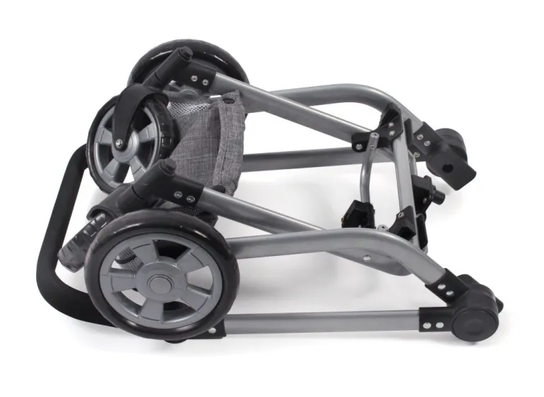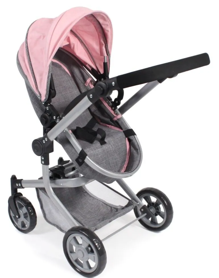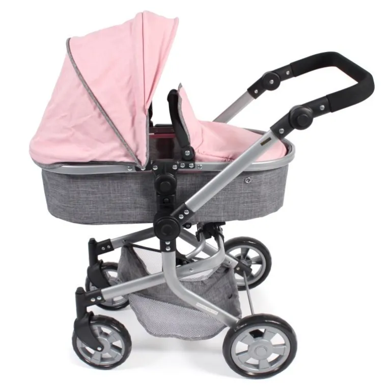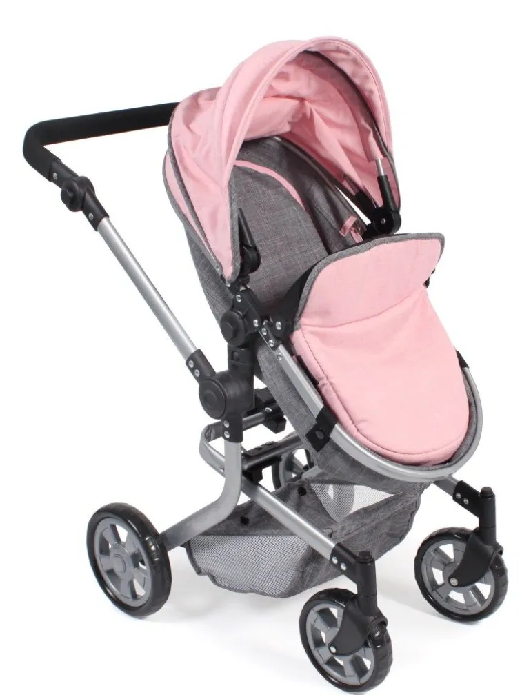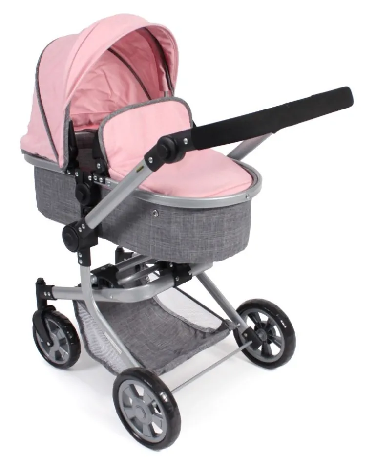 Topmodisch gestylter Kombi-Puppenwagen mit vielen praktischen Funktionen und schickem Gestell. Die schwenkbaren Vorderräder ermöglichen kinderleichtes Kurvenfahren. Der Sportsitz hat einen Sicherheitsbügel und lässt sich mit wenigen Handgriffen zum Wannenaufsatz mit ebener Liegefläche verwandeln. Die Abdeckung der Babywanne dient gleichzeitig als Winddecke für den Sportsitz. Der Sportsitz bzw. die Babywanne können beidseitig aufgesteckt werden, sowohl in Fahrtrichtung wie auch mit Blick zur Puppenmutti. Der Schiebegriff ist höhenverstellbar von ca. 47 bis 80 cm und passt sich so nahezu jeder Körpergröße an. Zudem lässt sich der Schieber schwenken, so dass der Puppenwagen von beiden Seiten aus gefahren werden kann. Mit Sonnenverdeck und Gepäcknetz für diverse Utensilien. Der Kombi Mika kann besonders einfach und klein zusammengeklappt werden. Für Puppen bis ca. 52 cm.