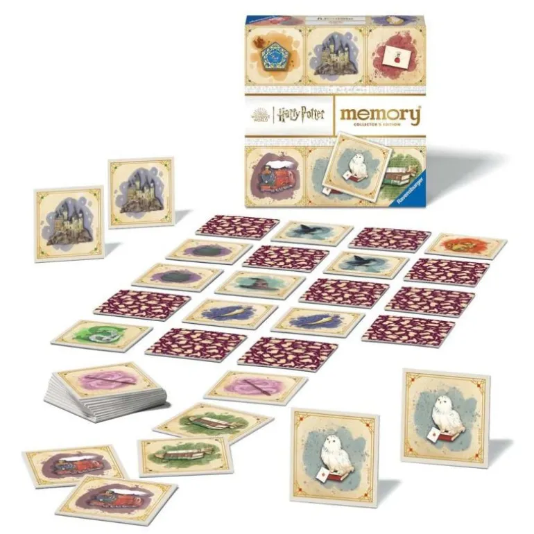 Collectors‘ memory® Harry Potter enthält 48 im Aquarell-Stil illustrierte Karten mit unterschiedlichen Gegenständen, die ein Schüler in Hogwarts einfach besitzen muss. Reihum decken die Spieler immer zwei Bildkarten auf. Zeigen beide Kärtchen das selbe Bild, darf dieses gesammelt werden. Es gewinnt, wer die meisten Bildpaare findet. Doch die Bildkarten sind zusätzlich mit Leuchtfarbe veredelt. Im Dunklen beginnt diese zu leuchten und mach Zaubersprüche und die damit verbundenen Bewegungen sichtbar. Das hebt die Suche nach Kartenpaaren auf eine ganz neue und herausfordernde Ebene. Für weiteren Spiel-Spaß sorgt eine zusätzliche Variante, bei der sich die Spieler zu Spielbeginn für eines der Häuser entscheiden: Hufflepuff, Slytherin, Ravenclaw oder Gryffindor. Gesammelt werden alle Karten, die ausschließlich zum ausgesuchten Haus gehören. Wer gewinnt den magischen Wettkampf um die Häuser?