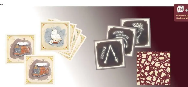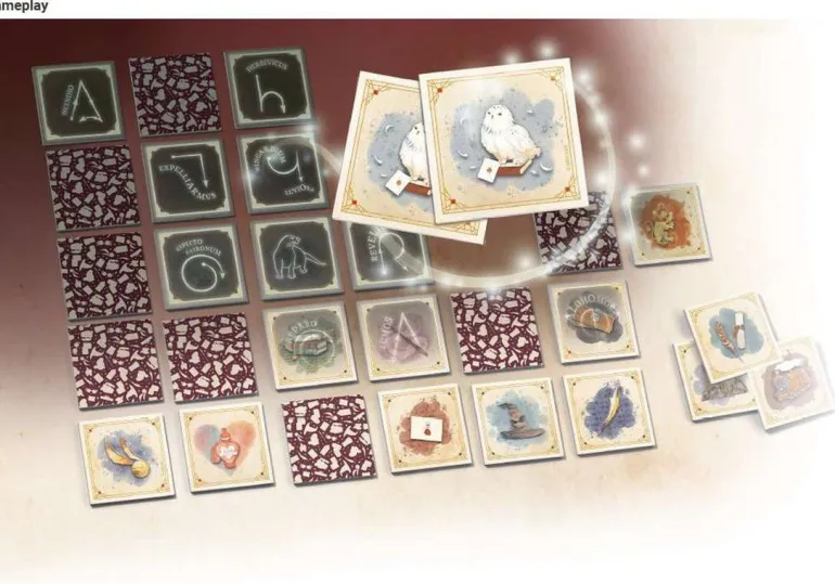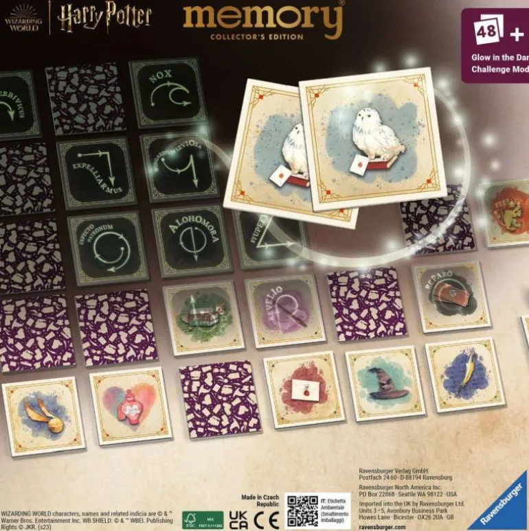 Die Motive sind illustriert und mit Leuchtfarbe veredelt, sodass sich dieser weltbekannte Klassiker auch im Dunkeln spielen lässt. Zauberstäbe, Eulen, magische Süßigkeiten, Bücher und Schreibfedern – gesucht werden immer zwei bildgleiche Kärtchen! Im Dunkeln fangen die Karten magisch zu leuchten an: Bisher verborgenen Zaubersprüche und ihre Bewegungen sind jetzt zu sehen und ganz neue Paare müssen gefunden werden.
