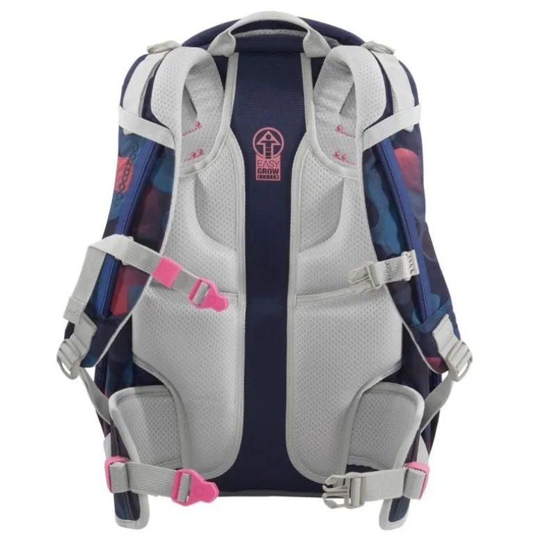 Easy-Grow-System: stufenlose Höhenverstellung der Schulterträger über Drehmechanismus im Inneren des Rucksacks – während das Kind den Rucksack trägt.
