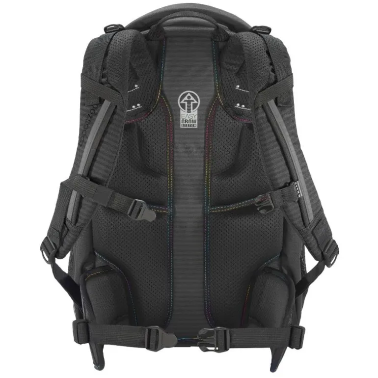 Easy-Grow-System: stufenlose Höhenverstellung der Schulterträger über Drehmechanismus im Inneren des Rucksacks – während das Kind den Rucksack trägt