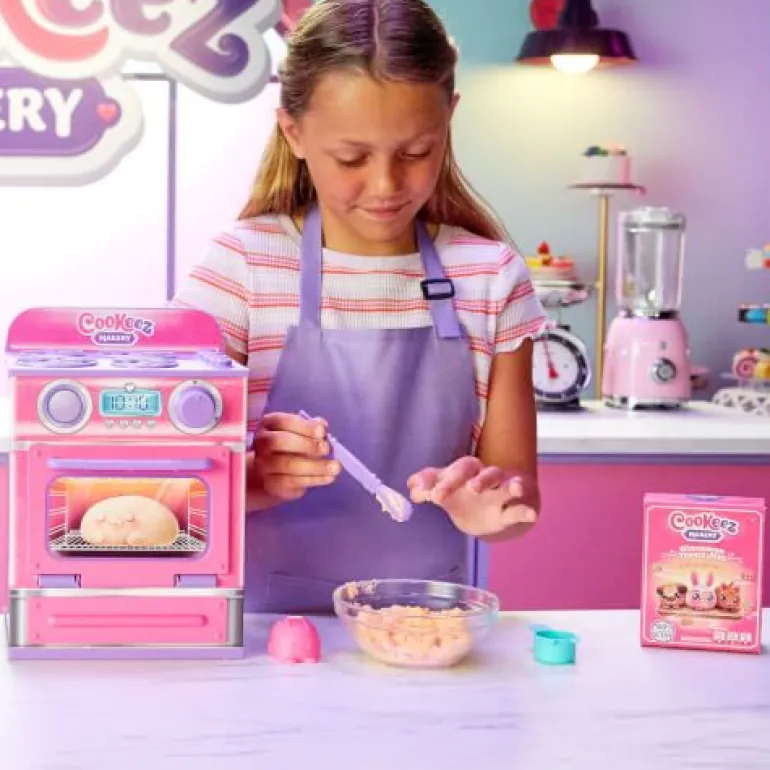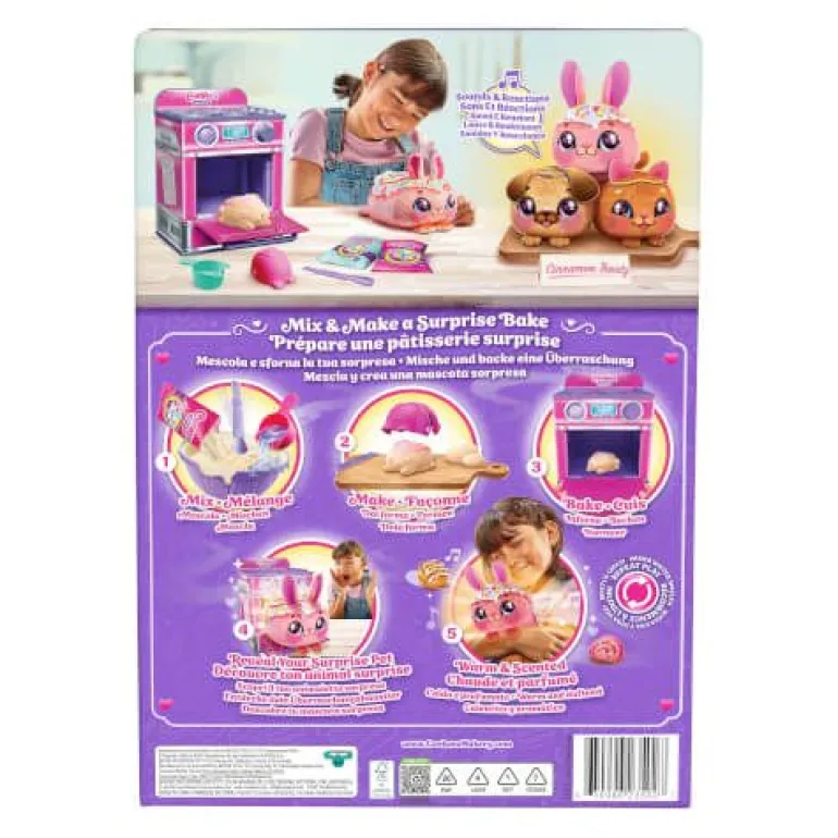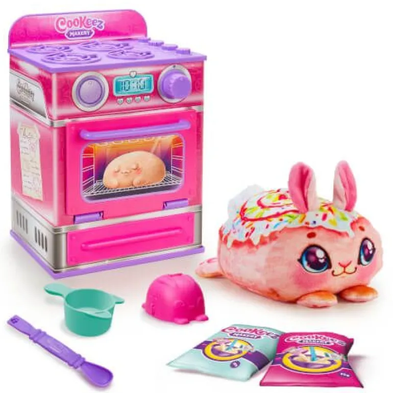 Mit Cookeez Makery können kleine Bäcker ihren neuen besten Kuschelfreund backen und alle ins Staunen versetzen! Das mit Zimt-Leckereien von Cookeez Makery enthält alles, was man braucht, um eine besondere Überraschung zu backen. Wird es ein Hündchen, Kätzchen oder Häschen? Als Erstes werden die Zutaten vermengt. Als Nächstes können die Teigform und das enthaltene Zubehör verwendet werden, um niedliche Details zu gestalten. Und jetzt ab in den Ofen! Nach 90 Sekunden macht es Ding. Zeit, um in den Ofen zu schauen. Wow! Im Inneren wartet ein warmes, lecker duftendes Plüschtier, das für interaktiven Spielspaß sorgt! Dein neuer Freund kommt frisch aus dem Ofen und macht niedliche Geräusche, wenn er gedrückt wird! Es gibt 3 verschiedene Plüschtiere zum Sammeln und Entdecken: Cinnamon Pooch, Fondant Feline und Strawberry Swirl! Der Backvorgang kann immer wieder wiederholt werden!