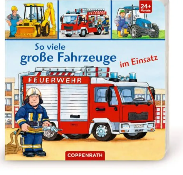 Traktor, Feuerwehr und Bagger – hier sind große Fahrzeuge im Einsatz! Pappbilderbuch mit drei Geschichten über Fahrzeugführer auf der Straße: Baggerfahrer, Feuerwehrmann und Bauer.