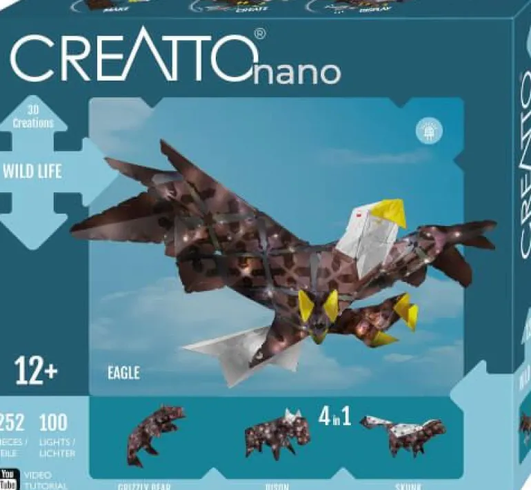 Der König der Lüfte breitet seine mächtigen Schwingen aus! Dieses Bastelset kombiniert clever die bewährten größeren CREATTO-Puzzleteile mit den neuen kleineren nano-Steckteilen und ermöglicht es so, raumgreifende 3D-Modelle mit feinen Details zu bauen und mittels beiliegender LED-Lichterkette zum Leuchten zu bringen.