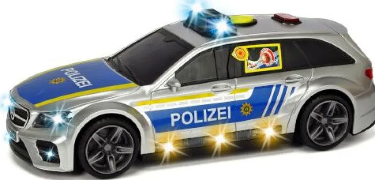 “Mercedes-AMG E 43 Polizei: immer einsatzbereit Der Mercedes-AMG E 43 gehört zu den beliebtesten Sportmodellen der großen Automarke. In so einem Flitzer macht das Ordnung hüten gleich noch einmal so viel Spaß. Dieses Vergnügen ist auch im Mercedes-AMG E 43 Polizei von Dickie Toys garantiert. Das detailverliebte motorisierte Spielzeugauto bietet so manche Überraschung.Die Heckklappe öffnet sich automatisch auf Knopfdruck und ein Hundegebell ertönt. Licht- und Soundeffekte aus der Polizeiwelt regen die Fantasie an und sorgen natürlich dafür, dass das Spielerlebnis noch eindrucksvoller wird. Kinder ab drei Jahren können sofort loslegen, denn die Batterien sind bereits enthalten. # Originalbez.: Mercedes-AMG E 43 # Motorisiertes Spielzeugauto mit Freilauf # Modell: Mercedes-AMG E 43 in deutscher Polizeioptik # Licht und Sound # Heckklappe öffnet per Knopfdruck mit Hundegebell-Soundeffekt # Batterien enthalten # Maßstab 1:16 # Länge: 30 cm # Altersempfehlung: ab 3 Jahren “