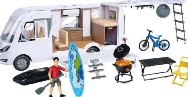 Freilauf Hymer Camping Van mit Interieur, Dach+Türen zum Öffnen, Gummireifen, Figur, 30 cm TB, BBQ mit Licht, Dachgepäck Box, Camping Zubehör, Fahrrad, weiss