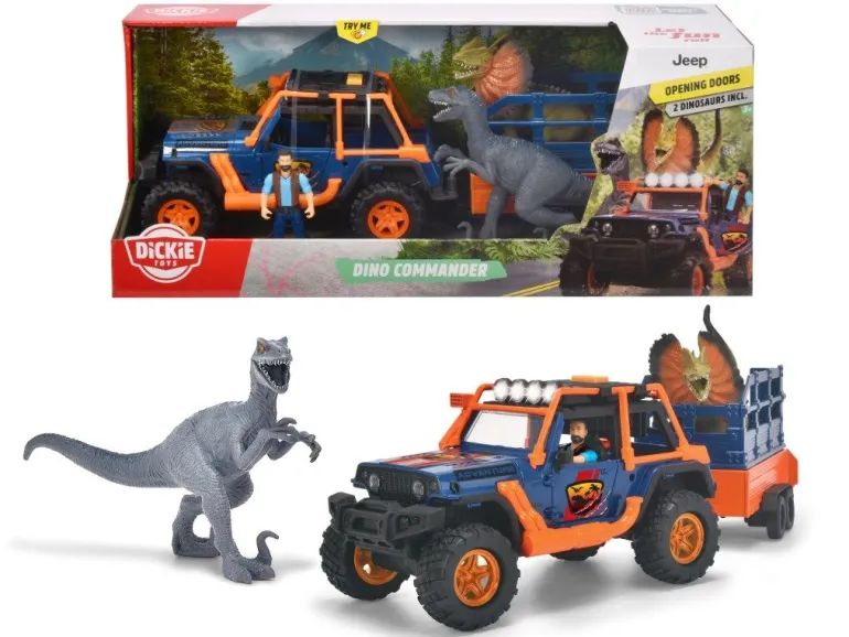 • Die Dinos sind los! – Mit seinem Geländewagen „Jeepster Commander“ (Original Jeep-Lizenz im Maßstab 1:24) samt Anhänger mit Käfig macht sich der Ranger auf die Suche nach den Riesenechsen.
