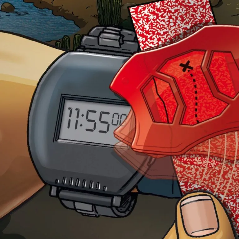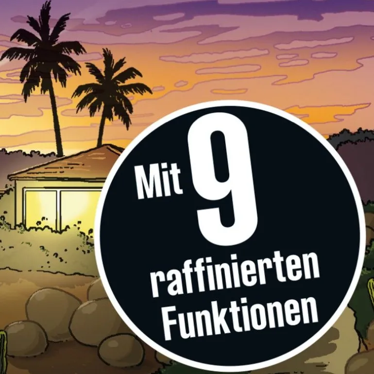 Mit neun raffinierten Funktionen: Uhr mit Datumsanzeige, Wecker, Stoppuhr, Zeitzonen, Lupe, Rotfolie und Block, Taschenlampe, Geheimkapseln und Alarmanlage.