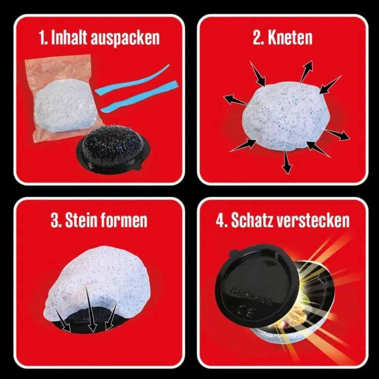 Die Kinder drücken die Knetmasse auf eine Form und modellieren den Stein möglichst realistisch. Unauffällig bleibt er so vor neugierigen Augen im Kinderzimmer oder Garten verborgen. Einfach der anschaulichen Anleitung folgen, die zeigt, wie sich der Stein mit dem Modellierwerkzeug bearbeiten lässt und das Geheimfach geschlossen wird. Justus, Peter und Bob wären begeistert: Dieses Versteck findet garantiert keiner!