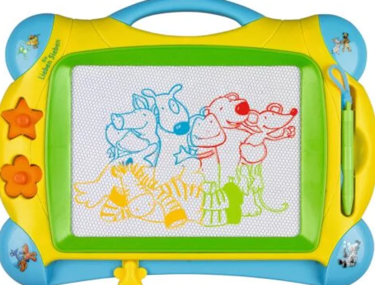 Magnetische Maltafel aus Kunststoff mit zwei Stempeln und einem Stift. Mit praktischem Tragegriff. Schreibt in grün, rot, gelb und blau! Für Kinder ab 3 Jahren.
