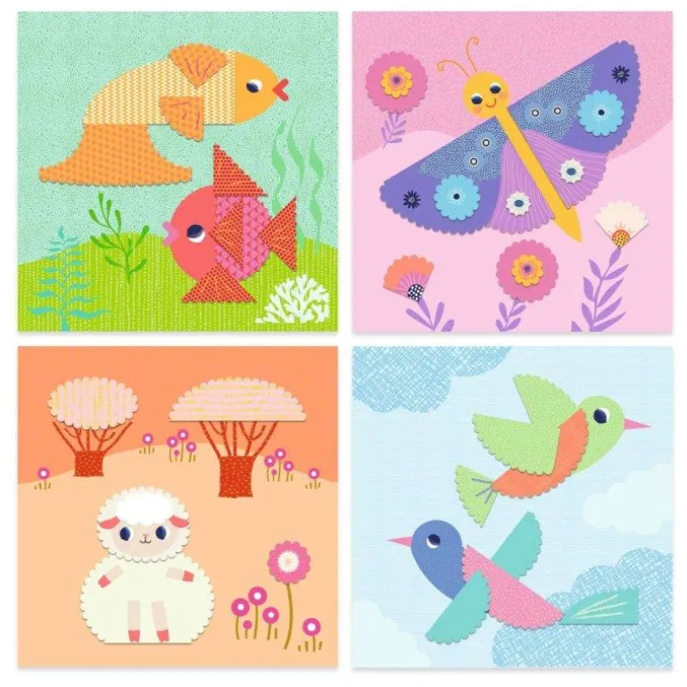 Inhalt: 9 illustrierte Bögen zum Ausschneiden, 4 illustrierte Karten zum Verzieren, 1 gezahnte Schere, 1 Bogen mit doppelseitigen Aufklebern und 1 Schritt-für-Schritt-Anleitung.