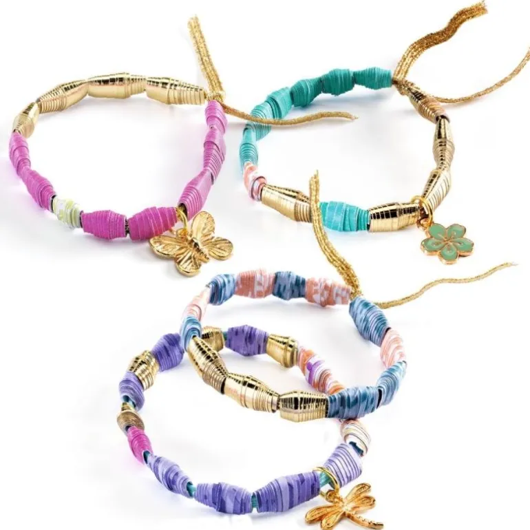 Ein kreatives Set, um zahlreiche bunte Armbänder zu kreieren, indem eigene Papierperlen hergestellt werden. Das Kind schneidet die mit Mustern bedruckten Vorlagen in Streifen, bestreicht diese mit Kleber und wickelt sie dann um ein Holzstäbchen. Die so hergestellten Perlen können auf einen Gummifaden gezogen werden, um hübsche Schmuckstücke zu kreieren! Einige können mit den mitgelieferten Charms verziert werden.