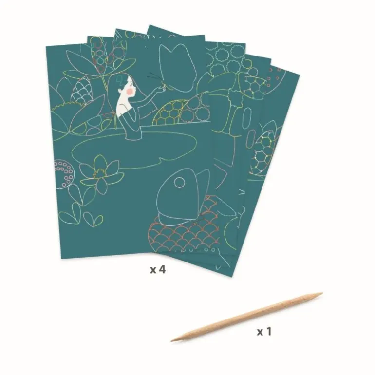 Ein Täschchen mit 4 schillernden Kratzbildern für einen angenehmen Spaziergang voller Überraschungen am Wasser entlang. Das Kind bildet die vom Künstler erdachten Motive nach. Hierzu kratzt es die Oberfläche mit Hilfe eines Holzstifts. Die Bilder werden für Schritt für Schritt, wie von Zauberhand, freigelegt!