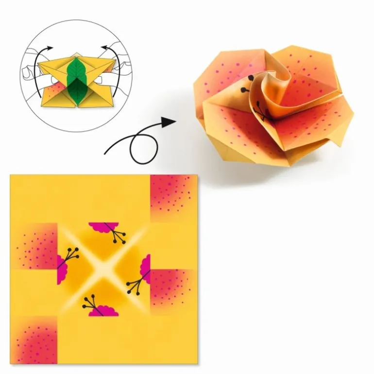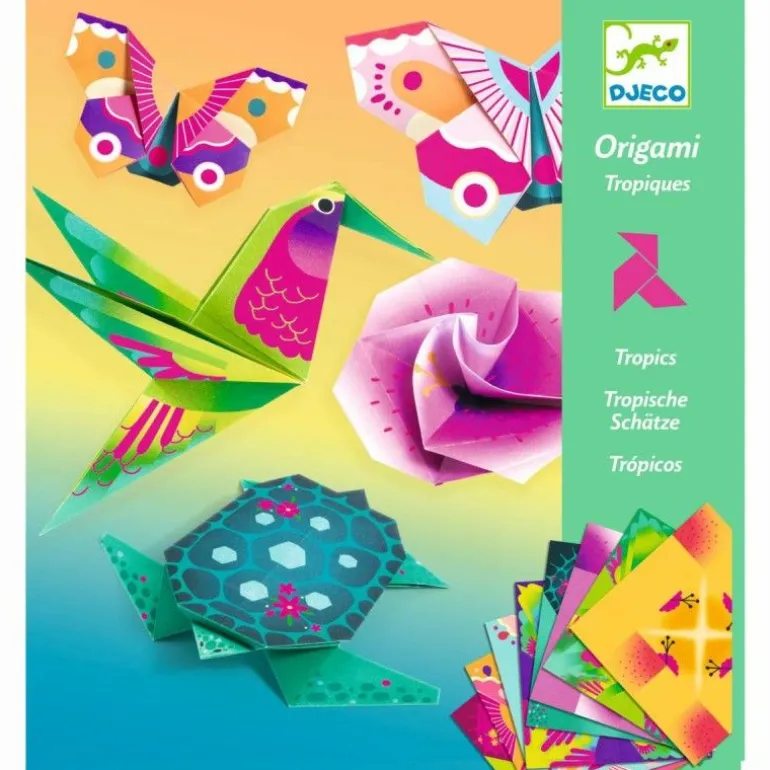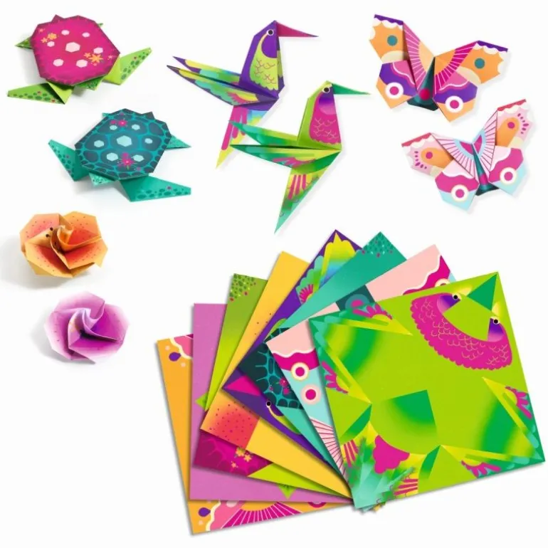 Mit diesem exotischen Origami-Set begeben Sie sich in die sonnigen Tropen. Sie werden auf Blumen, Kolibris, Schildkröten und Schmetterlinge in Neonpink treffen. Das Kind folgt den Erklärungen der Anleitung und den vorgegebenen Linien und faltet so 24 Schätze aus Papier!