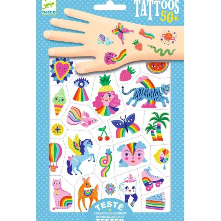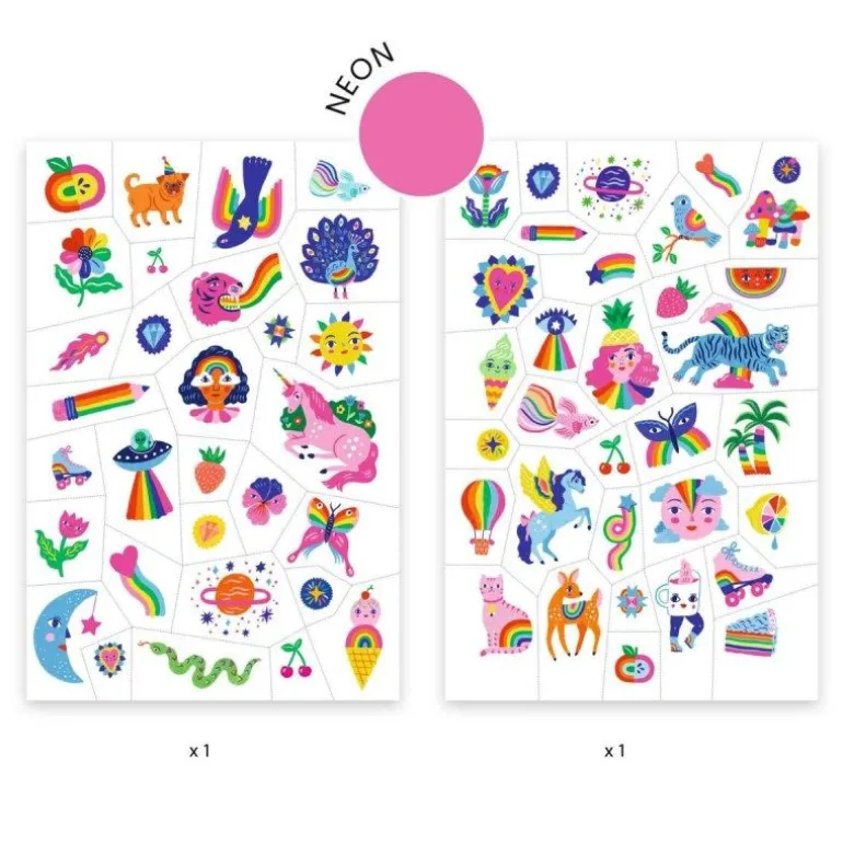 Zwei Bögen mit temporären Klebetattoos in den Farben des Regenbogens und im Pop-Stil, der durch die neonpinken Details betont wird! Für eine einfache Anwendung sind sie vorgestanzt und werden mit etwas Wasser aufgetragen. Dermatologisch getestet.